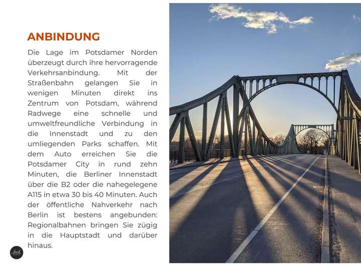 Die Verkehrsanbindung unterstreicht die Attraktivität der Lage zusätzlich. Die Straßenbahnhaltestelle „Campus Jungfernsee“ befindet sich nur wenige Schritte entfernt und ermöglicht die schnelle Verbindung ins Potsdamer Zentrum in rund 10–15 Minuten. Auch mit dem Fahrrad oder Auto sind die Innenstadt und das Berliner Umland bequem erreichbar. Über die A115 und A10 bestehen zudem direkte Anbindungen in die Hauptstadt und zum Flughafen BER.