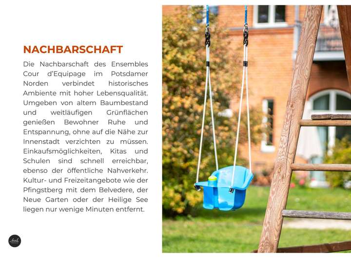 Die Lage im Potsdamer Norden bietet neben historischem Flair auch einen hohen Freizeitwert. Der nahe gelegene Jungfernsee mit seinen Uferwegen und das Nedlitzer Holz laden zu Spaziergängen, Radtouren und Wassersport ein, während der BUGA-Park ein breites Angebot an Natur, Erholung und Kultur bereithält.