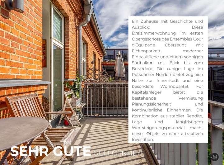 Die angebotene, vermietete Wohnung befindet sich in einem denkmalgeschützten Ensemble, dem Cour d’Équipage, in Potsdam und liegt im ersten Obergeschoss eines aufwendig sanierten Gebäudes. Das historische Objekt wurde um 1892 erbaut und im Jahr 2012 umfassend kernsaniert und fertiggestellt, sodass historischer Charme und moderner Wohnkomfort hier eine gelungene Verbindung eingehen.