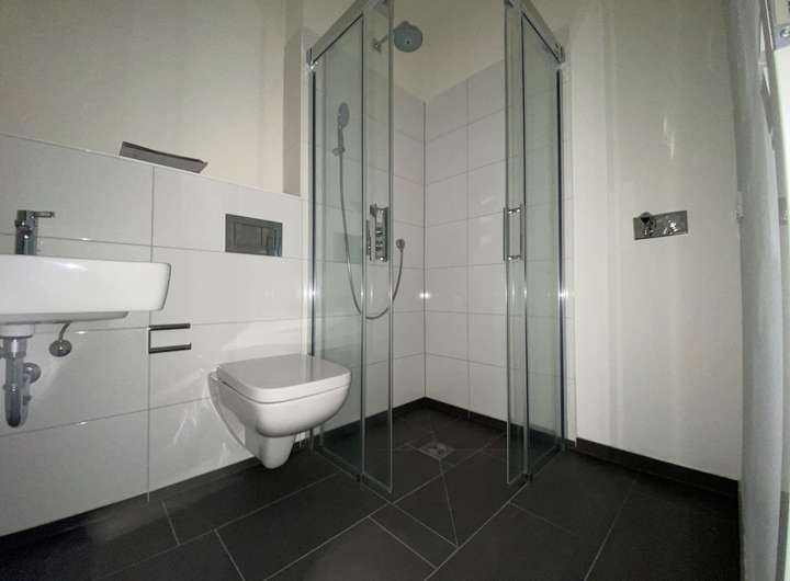 Das stilvolle Badezimmer verfügt über eine moderne Dusche sowie einen praktischen Waschmaschinenanschluss. Ein zur Wohnung gehörender Kellerraum bietet zusätzlichen Stauraum.