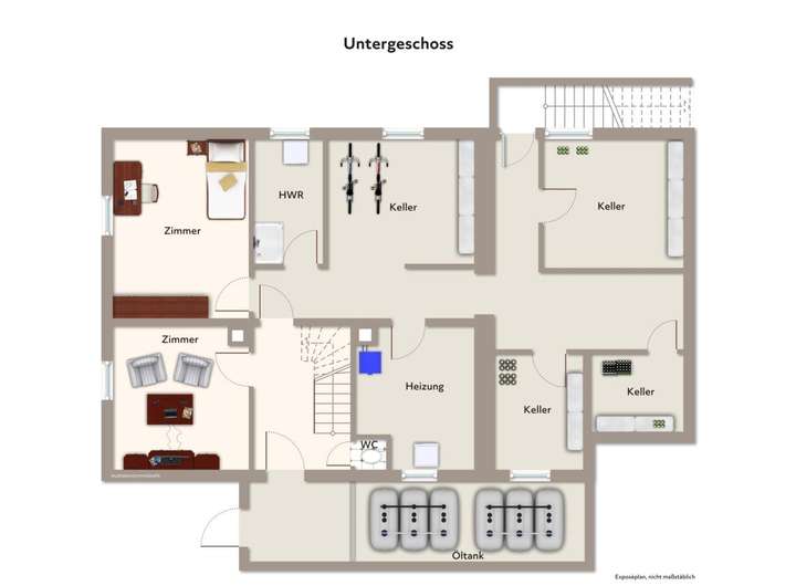 Im Untergeschoss ergänzen zwei zusätzliche Räume, ein Bügelzimmer, ein Trockenraum, zwei Keller sowie ein Wasch- und Heizungsraum das Platzangebot.