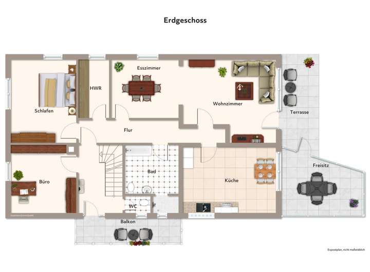 Das Obergeschoss bietet eine helle 4,5-Zimmer-Wohnung (leerstehend) mit Terrasse und Freisitz – ideal für Familien oder Paare mit Platzbedarf.