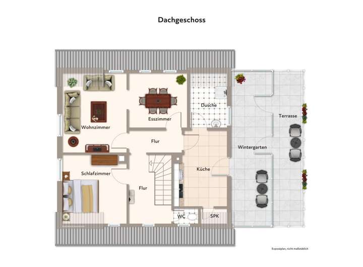 Im ersten Dachgeschoss befindet sich eine gemütliche 3-Zimmer-Wohnung (vermietet) mit Terrasse und Wintergarten, die derzeit vermietet ist.