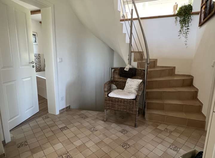Über eine Treppe gelangt man in das Dachgeschoss.