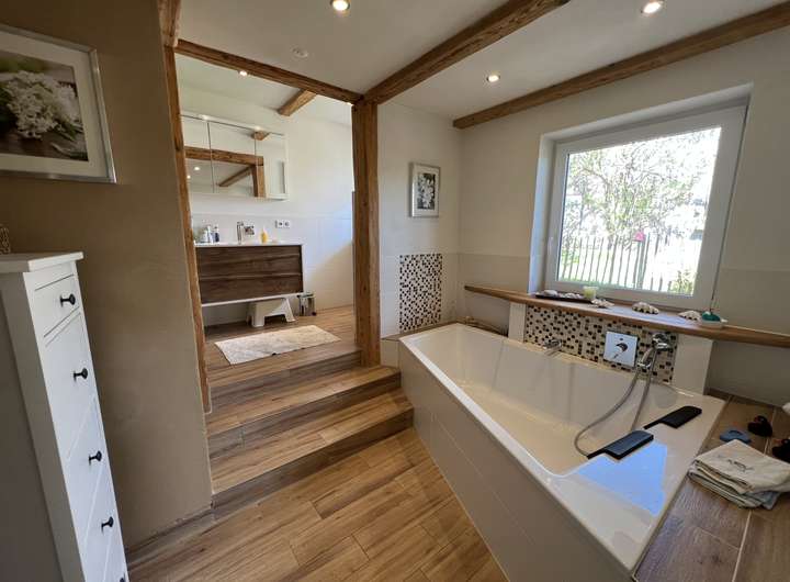 Zudem befindet sich im EG noch ein Badezimmer mit Dusche, Badewanne und WC, sowie ein großes Schlafzimmer.