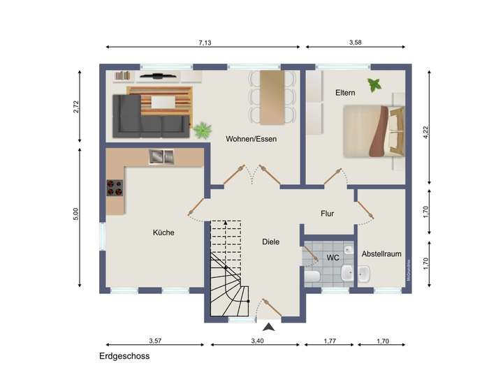 Die Immobilie betreten Sie über einen hellen Eingangsbereich. Das Erdgeschoss verfügt über 85 qm und ist perfekt aufgeteilt in ein lichtdurchflutetes Wohn- und Esszimmer, einer Küche, einem Esszimmer, Schlafzimmer, einem Gäste WC, sowie einem Vorratsraum/ Hauswirtschaftsraum.