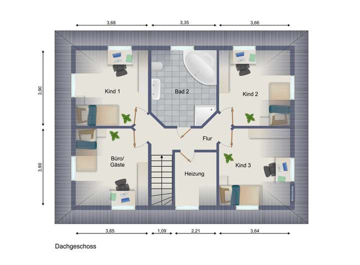 Flur// Schlafzimmer// Kinderzimmer// Kinderzimmer// Kinderzimmer// Badezimmer (Becken, Becken, Dusche, Wanne, WC) Fußbodenerwärmung// Heizungsraum