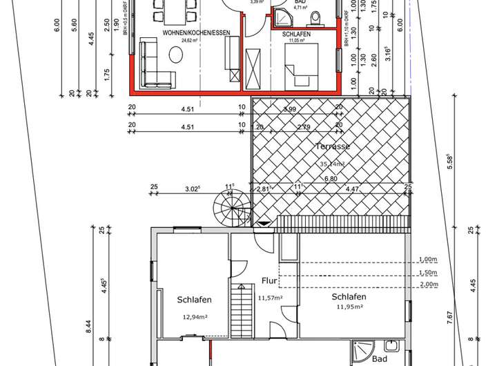 - Wohnung im Erdgeschoss und Obergeschoss: ca. 54,1 m²