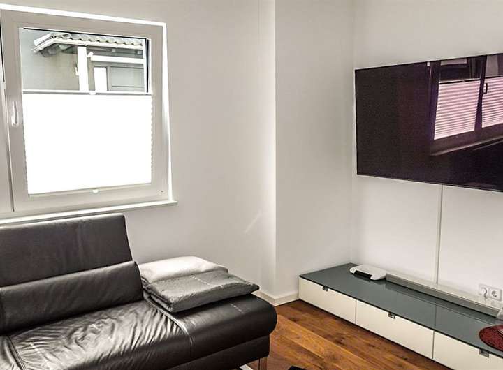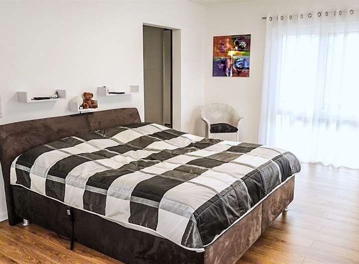 Im Obergeschoss befinden sich drei weitere Schlafräume, ein Tageslichtbad mit bodentiefer Dusche sowie im Haupt-Schlafzimmer ein maßgefertigter Ankleideraum und zusätzlich ein separates Tageslicht-Masterbad mit großer, begehbarer Dusche, einer Badewanne, doppeltem Waschbecken und elektrischem Handtuchwärmer. Hier werden Sie morgens beim Aufstehen mit Blick ins satte Grün begrüßt, abends vom Gesang der Aach in sanfte Träume begleitet.