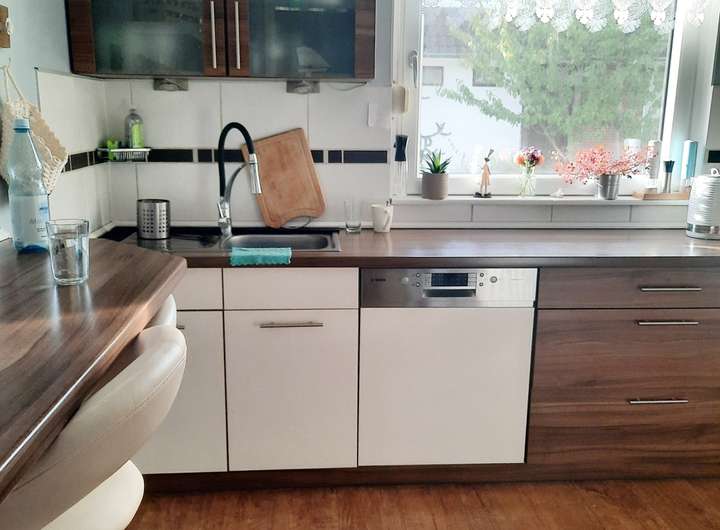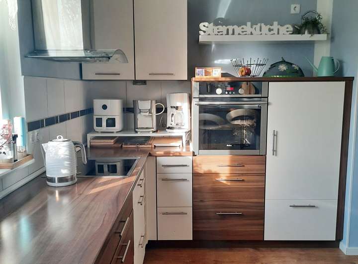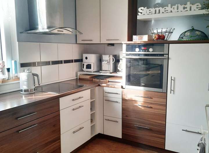 Die Einbauküche kann auf Wunsch per Abstandszahlung von den jetzigen Mietern übernommen werden. Ein Hauswirtschaftsraum an der Küche bietet viel Stauraum.