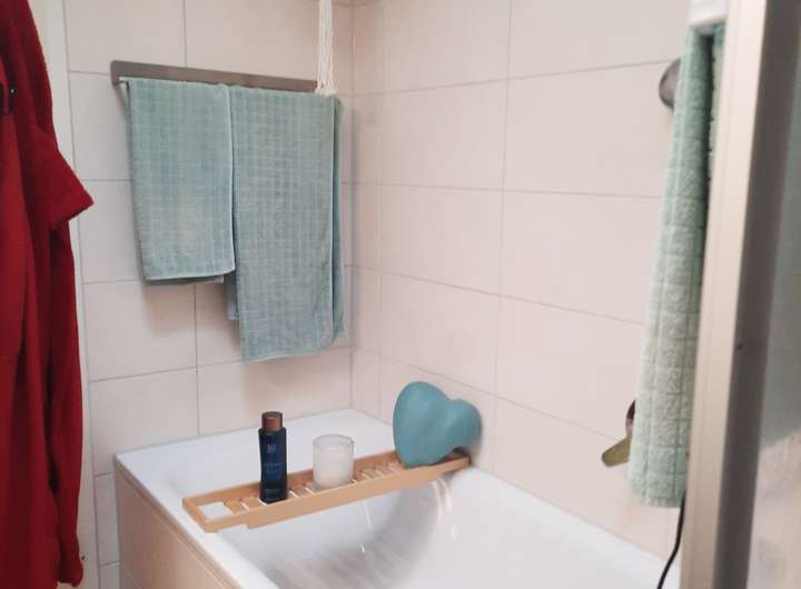 Das neuwertige Badezimmer ist geschmackvoll mit cremefarbenen Fliesen gestaltet und wird – ebenso wie der Flur – durch Oberlichter natürlich belichtet. Ein separates Gäste-WC bietet zusätzlichen Komfort.
