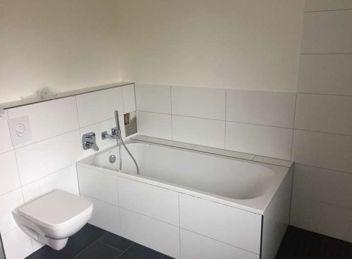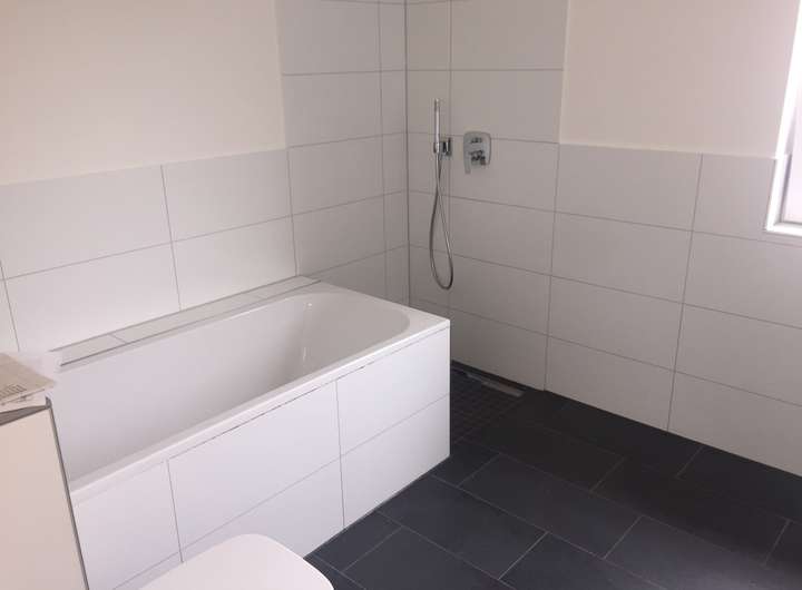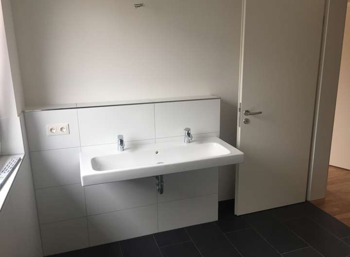 Die moderne Ausstattung manifestiert sich z.B. im Eichenparkett über der Fußbodenheizung, einer Vollholztreppe ins Obergeschoß, Hell/ Dunkel Optik bei den großformatigen Fliesen, Doppelwaschbecken und Ganzglasdusche etc