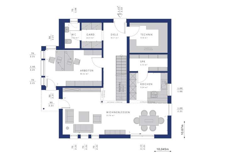 Der Grundriss dieses Hauses ist so durchdacht, dass er sowohl Familien als auch Paaren oder Einzelpersonen ein Höchstmaß an Komfort bietet. Die einzelnen Zimmer sind geschickt miteinander verknüpft, sodass Privatsphäre ebenso gewährleistet ist wie offene Gemeinschaftsbereiche für gemeinsame Stunden mit Familie und Freunden. Trotz der großzügigen Wohnfläche bleibt das Design übersichtlich und harmonisch und lässt Spielraum für individuelle Anpassungen.