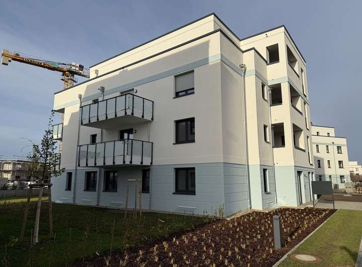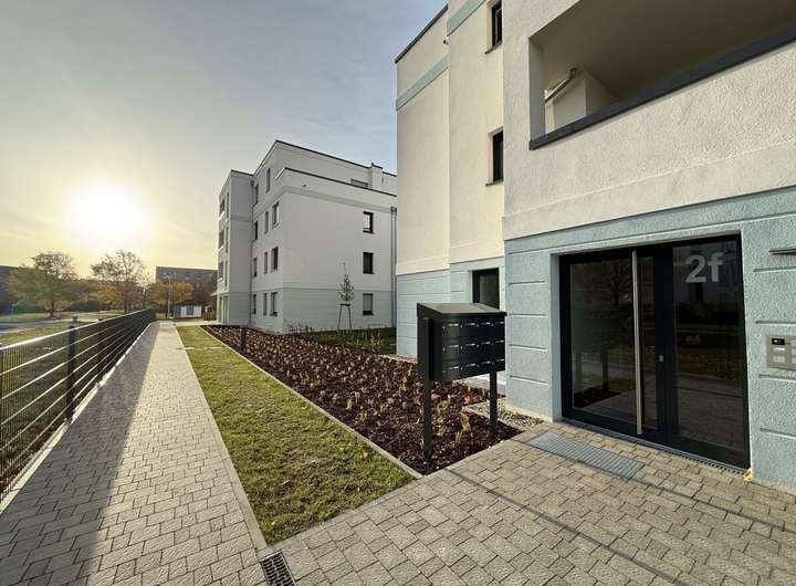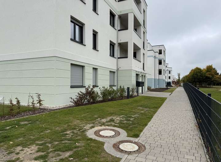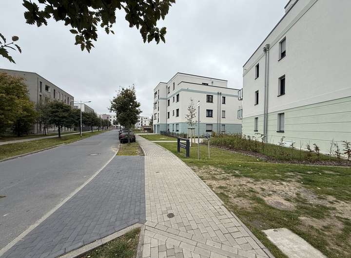 Der moderne Wohnkomplex besteht aus neun Mehrfamilienhäusern, die sich derzeit in der finalen Fertigstellungsphase befinden. Inmitten der Anlage liegt ein kleiner Spielplatz, der sich ideal für Familien eignet. Außerdem befindet sich hier der Zugang zur Tiefgarage. Alle Gebäude sind unterkellert und verfügen über praktische Fahrradabstellräume sowie großzügige Kellerabteile, die den Bewohnern zusätzlichen Stauraum zur privaten Nutzung bieten.