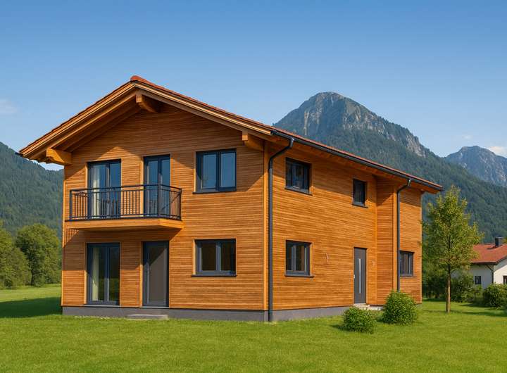 Die gezeigte Visualisierung stellt ein realistisches Neubau-Beispiel dar, das sich mit regionaler Architektur, hochwertigen Materialien und alpinem Stil harmonisch in das Umfeld einfügt.
