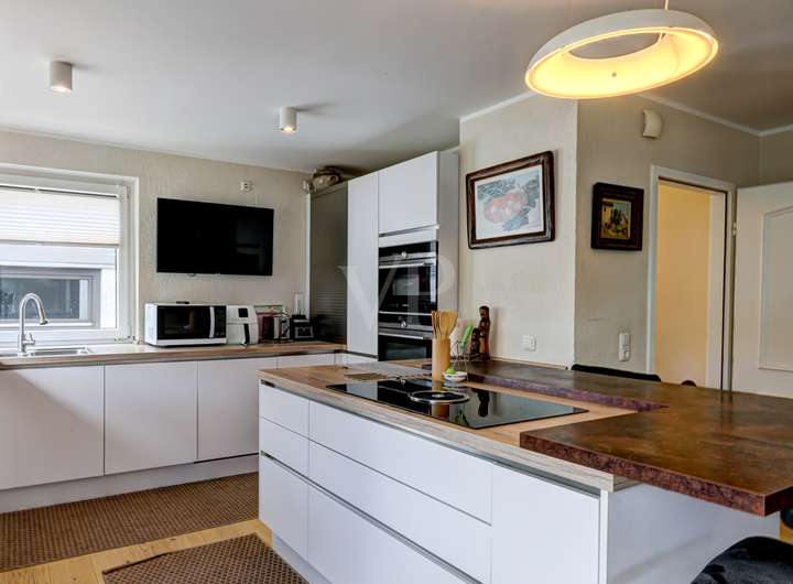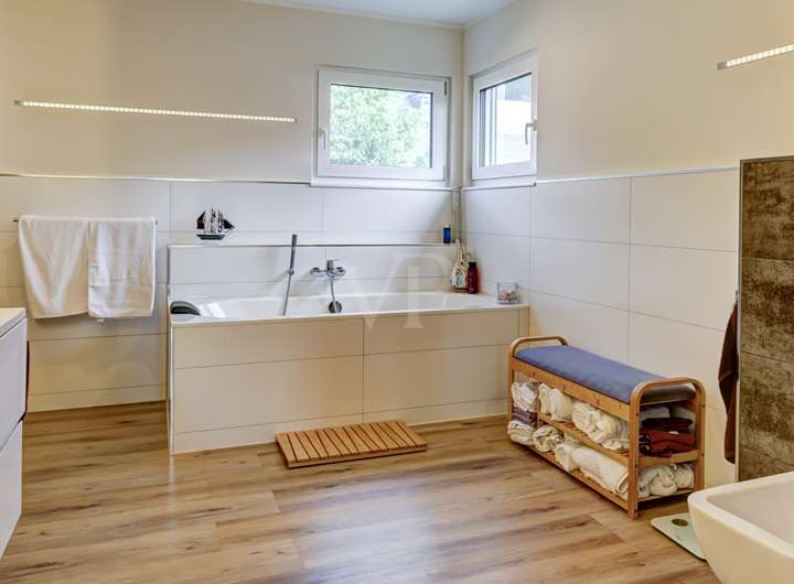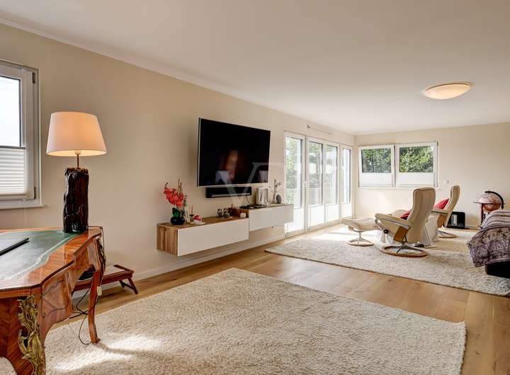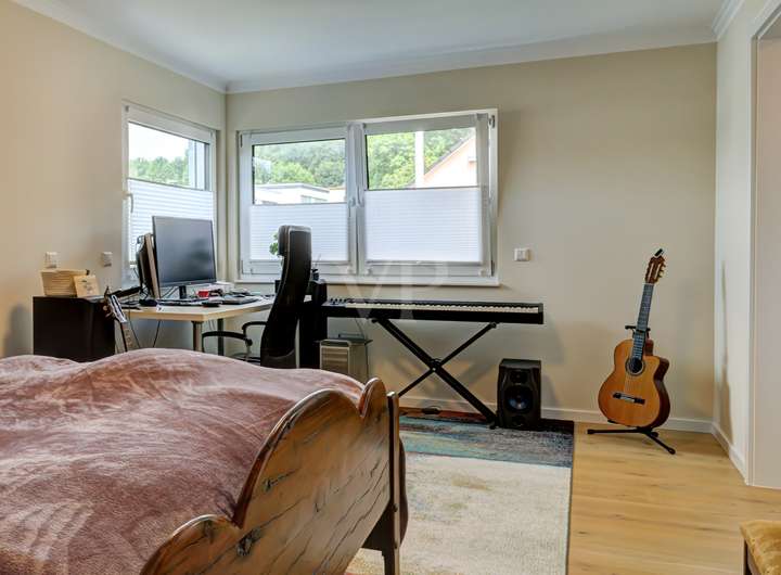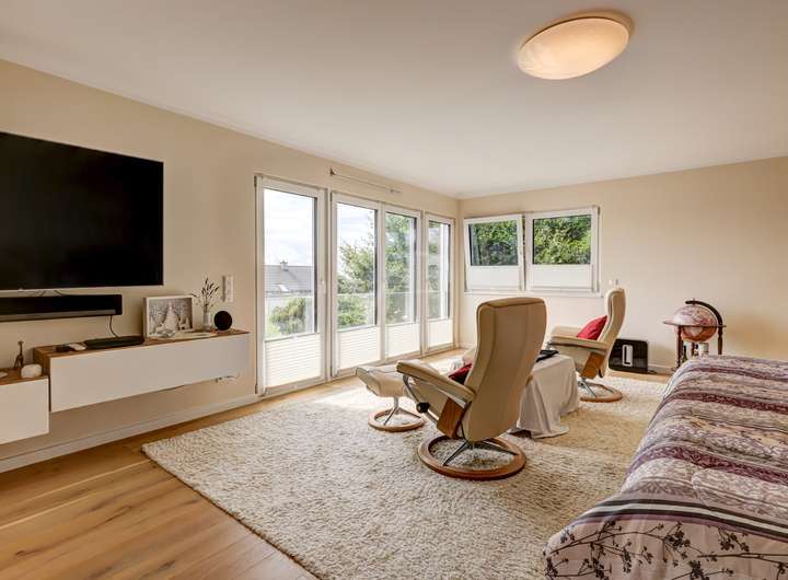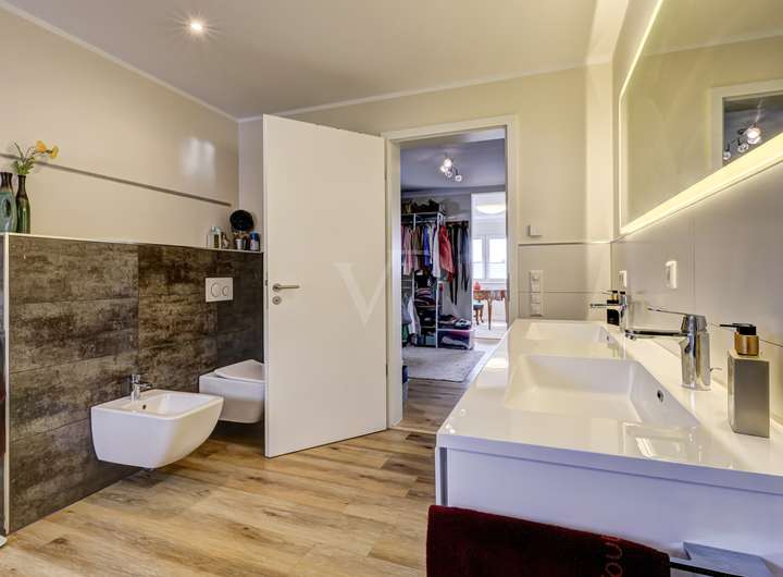 Das neuwertige Obergeschoss mit Fußbodenheizung und Klimaanlage in den Schlafzimmern bietet absolute Wohnqualität. Ein weiterer Pluspunkt: der gut nutzbare, Dachboden mit spektakulärem Fernblick.