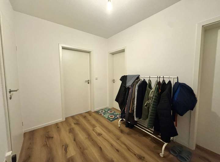 Beim Betreten empfängt Sie ein einladender Flur, der aufgrund seiner angenehmen Breite mehr bietet als nur eine reine Durchgangsfläche. Hier lassen sich beispielsweise Garderobe oder ein kleiner Konsolentisch stilvoll integrieren – ein erster Eindruck von der gut geschnittenen Gestaltung der Wohnung.