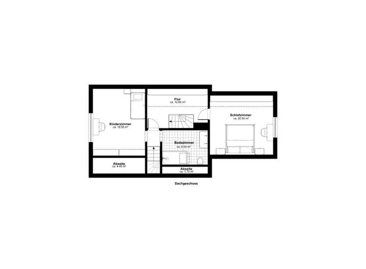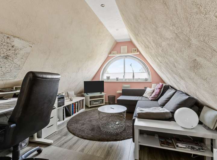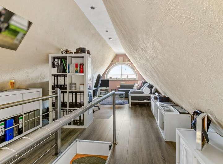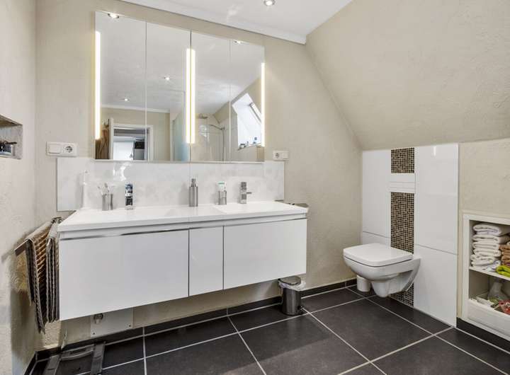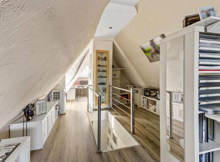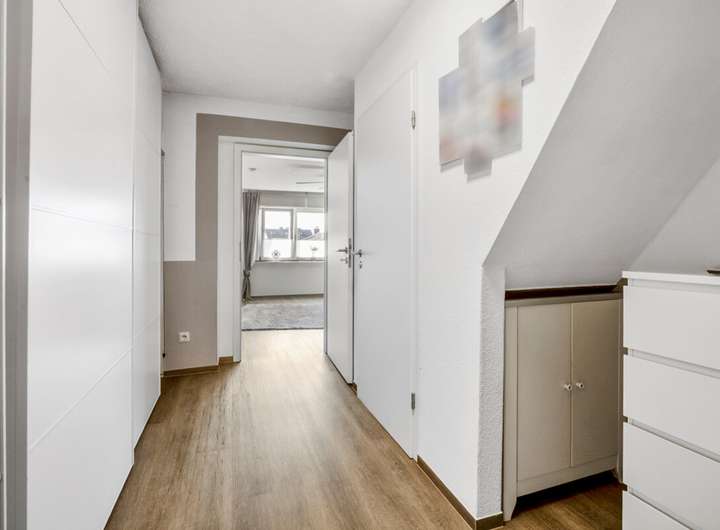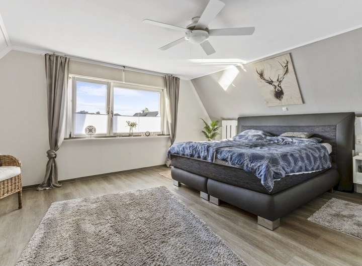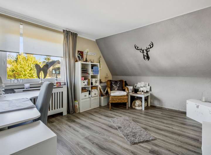 Im Obergeschoss setzt sich das großzügige Raumkonzept fort. Hier stehen zwei Schlafzimmer sowie ein helles, modern ausgestattetes Badezimmer mit Doppelwaschtisch, bodentiefer Dusche und viel Platz zur Verfügung. Das Ankleidezimmer vor dem Schlafzimmer bietet zusätzlichen Stauraum und führt in das ausgebaute Dachgeschoss, das derzeit als Büro genutzt wird.