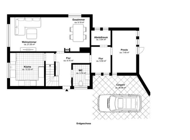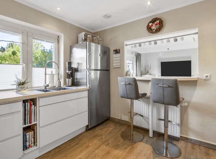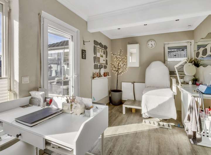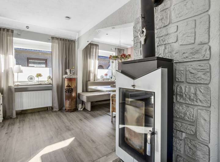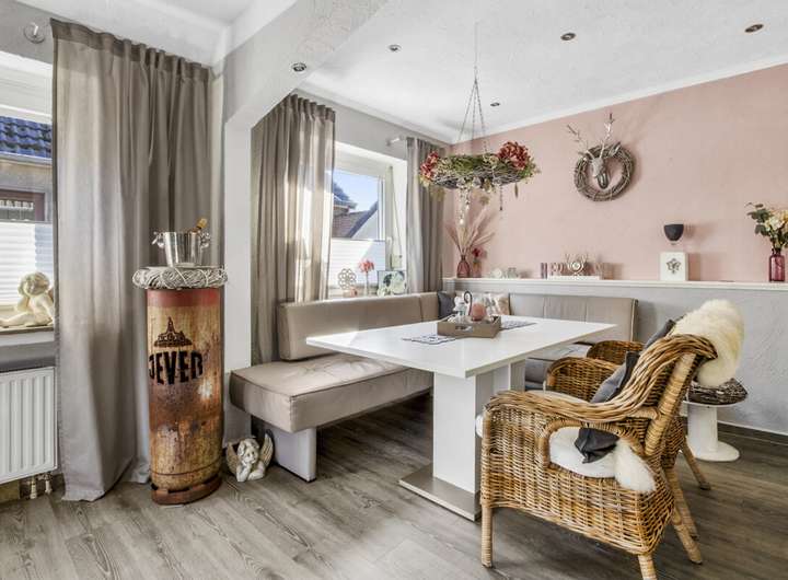 Bereits beim Betreten des Hauses wird deutlich, das viel Wert auf eine moderne und wohnliche Atmosphäre gelegt wird. Im Erdgeschoss erwartet Sie ein heller Eingangsbereich, der in das lichtdurchflutete Wohn- und Esszimmer mit Kaminofen übergeht. Die moderne Küche ist mit hochwertigen Geräten ausgestattet und bietet Ihnen einen Tresen mit Blick in das Wohnzimmer. Ebenfalls im Erdgeschoss befinden sich ein stilvoll modernisiertes Gäste-WC, ein kleiner Vorratsraum sowie ein derzeit gewerblich genutzter Praxisraum mit separatem Zugang.