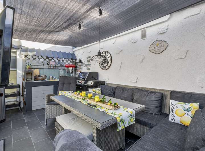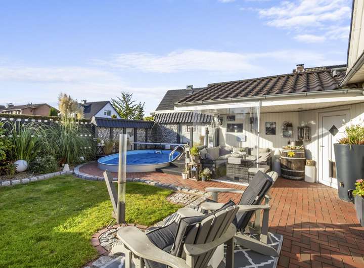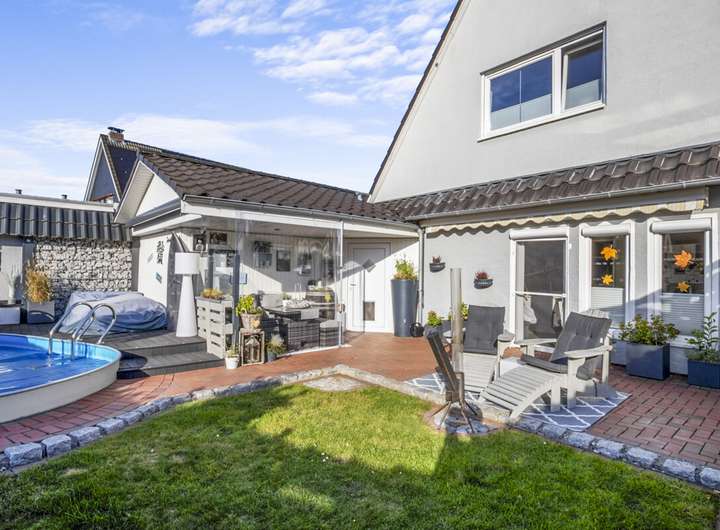 Das Grundstück mit 499m² ist liebevoll angelegt und überzeugt mit einem harmonischen Außenbereich. Der Garten bietet einen Swimming-Pool mit Terrasse, einen überdachten Terrassenbereich und einen Sommer-/Wintergarten mit Outdoor-Küchenbereich. Im hinteren Teil des Carports befindet sich ein geschlossener Abstellraum für Fahrräder, Gartenmöbel und Pooltechnik.