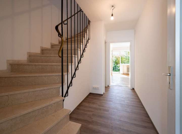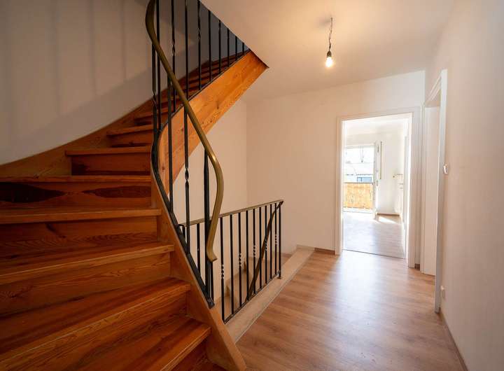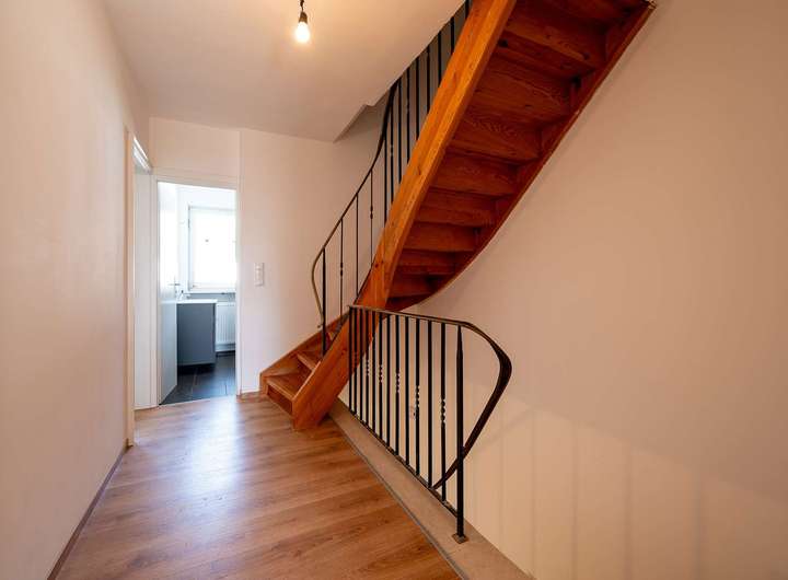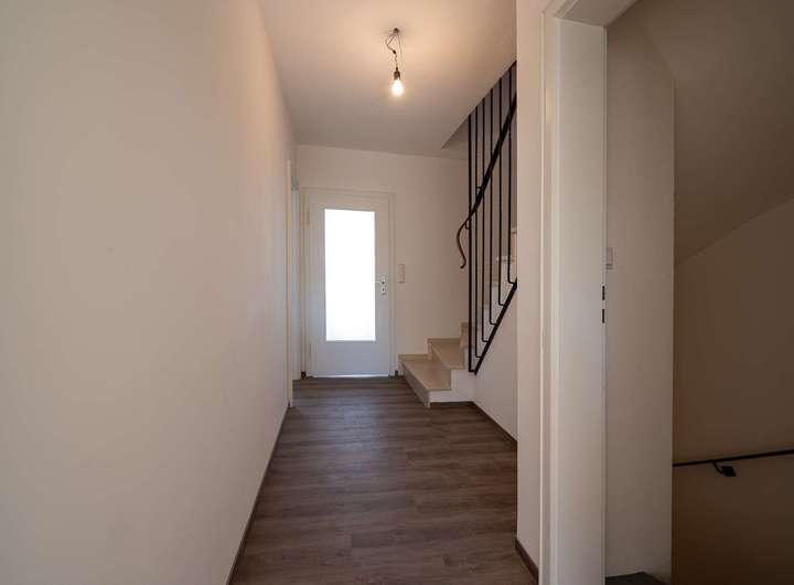 Nach dem Betreten des Hauses gelangen Sie in einen kleinen Windfang mit angrenzender Diele und Platz für Ihre Garderobe. Linker Hand befindet sich das gerade renovierte Gäste-WC, rechts die geräumige Küche. Eine Einbauküche ist nicht Bestandteil des Angebots und ist vom Mieter selber zu beschaffen. Von der Küche aus gibt es einen Durchgang ins Wohnzimmer mit Raum für Essen und Wohnen.