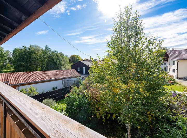 Das helle Wohnzimmer hat Zugang zur Südwest-Veranda auf der es sich aufgrund des darüber liegenden Balkons geschützt entspannen läßt. Die Veranda liegt erhöht und schafft Zugang zum idyllischen Garten über eine Treppe.
