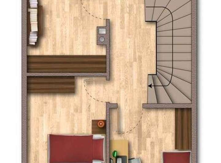 Im Obergeschoss befinden sich zwei Kinderzimmer (ca. 10,5 qm und 11,5 qm) und das Elternschlafzimmer (ca. 20 qm). Zwei der Zimmer haben Zugang zum Südwest-Balkon.