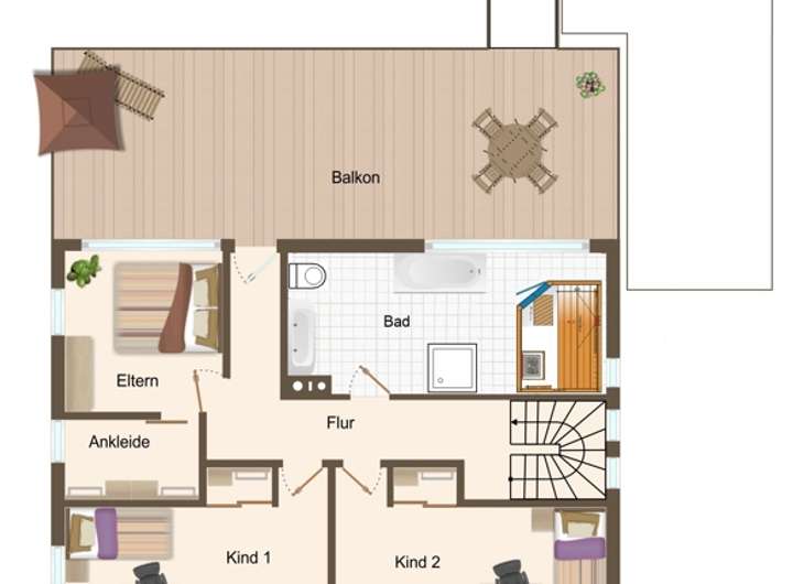 Im Obergeschoss befindet sich der Elterntrakt mit Schlafzimmer mit angrenzender Ankleide und Zugang zur privaten Dachterrasse. Zwei weitere Schlafzimmer bieten vielseitige Nutzungsmöglichkeiten – ob als Kinder-, Arbeits- oder Gästezimmer. Das moderne, geräumige Badezimmer ist mit Dusche, Badewanne und einer integrierten Sauna ausgestattet und verfügt ebenfalls über einen direkten Zugang zur Dachterrasse – ein besonderes Highlight, das Entspannung mit Außenkomfort verbindet.