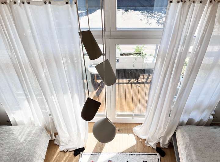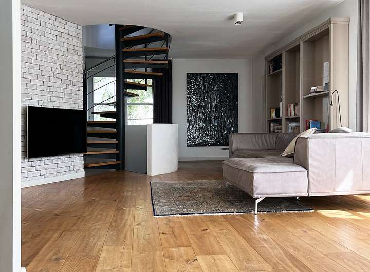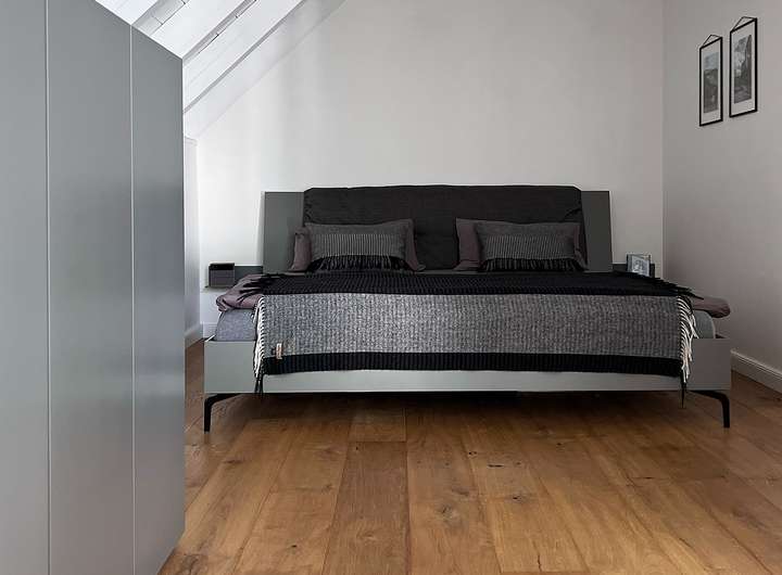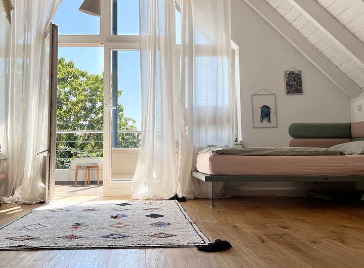 Eine Wendeltreppe führt in die obere Etage mit einem Bad en suite. Die hochwertige Badezimmerausstattung rundet das Angebot ab. Ein geräumiges, sonniges Zimmer mit Empore und Süd-Balkon befindet sich ebenfalls auf der oberen Etage.