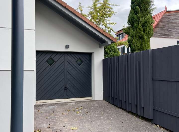 Im Erdgeschoss befindet sich ein heller Wohnbereich mit halboffener Einbauküche. Eine Terrassentür führt zu dem hinteren Gartenbereich und zur Garage inklusive Werkstatt.