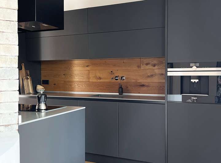 Einbauküche der Marke Next 125 mit Lava-Glas-Fronten inklusive Elektrogeräten von Siemens, Kühlschrank von Liebherr