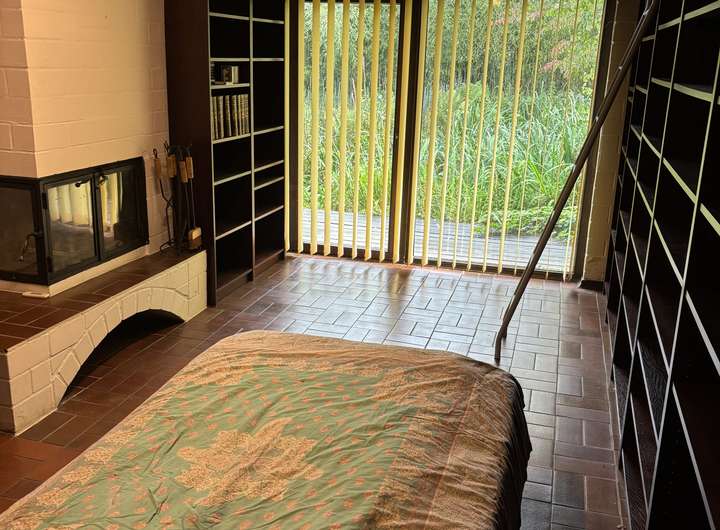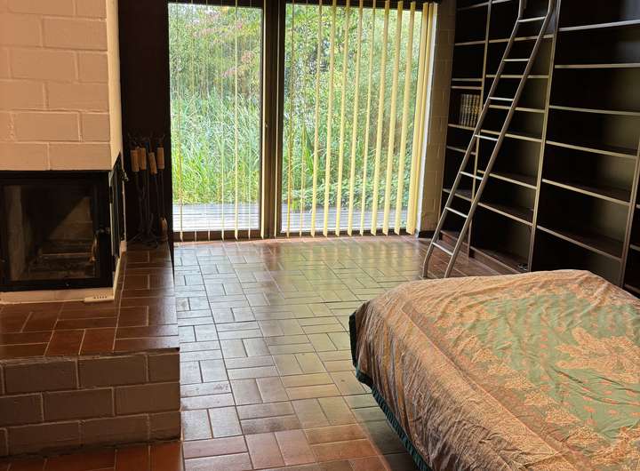 Das direkt angrenzende Zimmer lässt sich als Büro oder Bibliothek nutzen, wobei der Innen- und Aussenkamin für eine behagliche Atmosphäre sorgt.