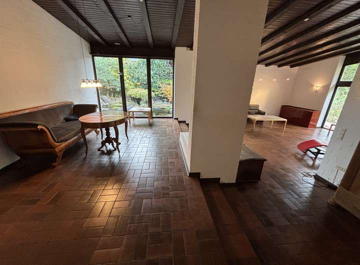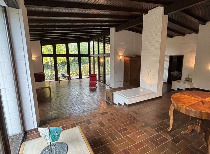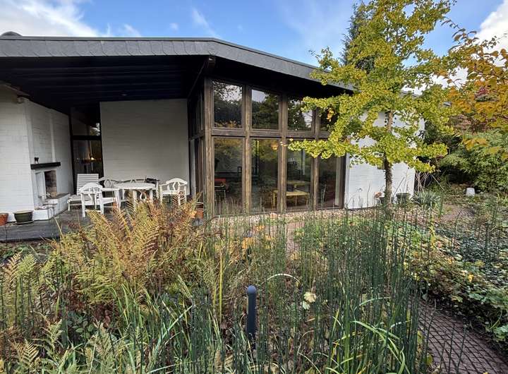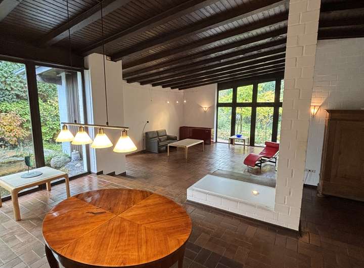 Den Mittelpunkt dieses individuell gestalteten Architektenhauses bildet das große Wohnzimmer mit seinen großen Fensterfronten und der offenen Holzbalkendecke. Von diesem gelangt man zur wind- und wettergeschützten Südterrasse, die den Blick in den nicht einsehbaren Garten ermöglicht und ganzjährig zum Verweilen einlädt.