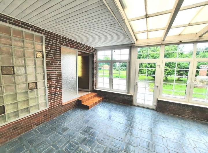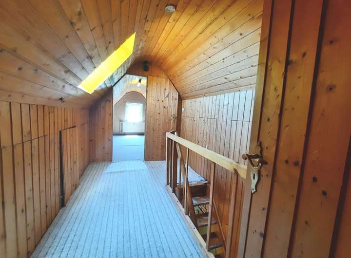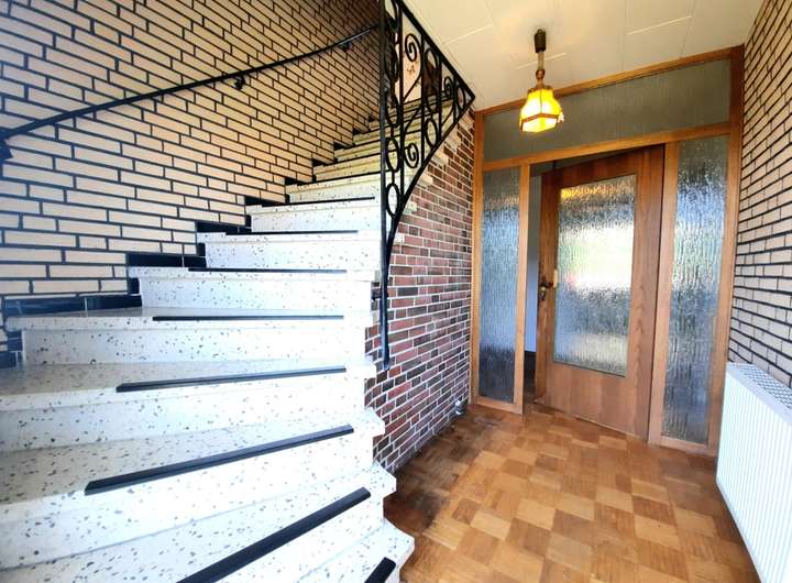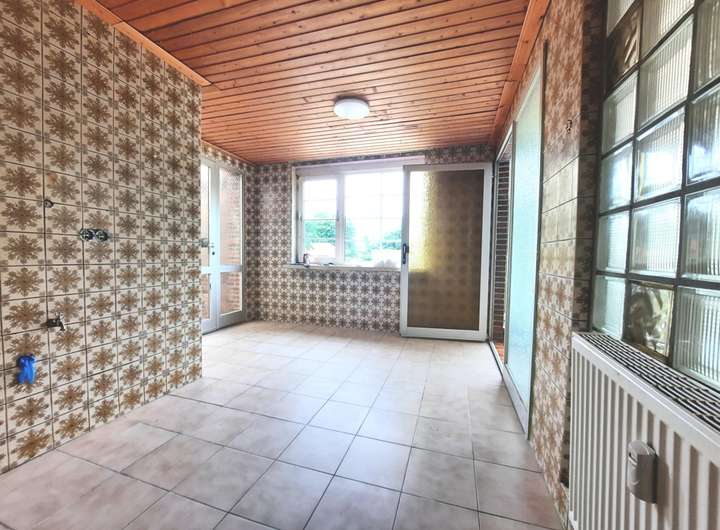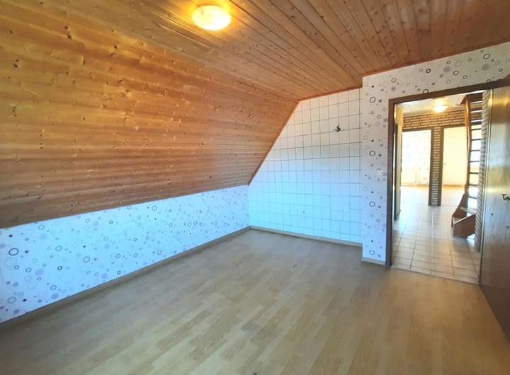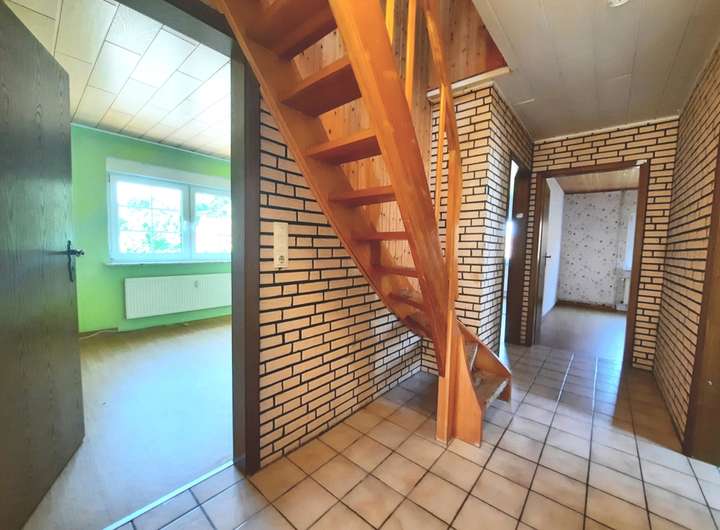 Dieses Wohnhaus mit Anbau wurde im Jahre 1971, mit entsprechend hochwertigen Materialien als massiver Klinkerbau erbaut und bezogen. Betritt man das Hauptgebäude durch den straßenseitigen Haupteingang, gelangt man zunächst in einen sep. Windfang, der zum einen das Treppenhaus in das riesige Obergeschoss und das voll ausgebaute Dachgeschoss führt und zum anderen über einen weiteren Flur, in das ebenso große Erdgeschoss. Von diesem Flur gelangt man rechts in das sehr große Wohnzimmer, in die Hauptküche, in das Elternschlafzimmer und in das geräumige Kellergeschoss, in dem sich auch die Heizungsanlage befindet. Zwischen Hauptküche und dem großen Wohnzimmer gibt es einen weiteren Raum, der entweder als Fernsehzimmer oder als zusätzliches Esszimmer genutzt werden kann. Von dem Vorflur gelangt man in den großen Hauswirtschaftsbereich, wo eine zweite Küche untergebracht war. Die Anschlüsse sind noch existent. Des Weiteren gibt es hier einen Vorratsraum ein sep. Badezimmer mit Dusche, Waschtisch und WC, sowie weitere Stellflächen für Schränke, Regale, Waschmaschinen und  Wäschetrockner im angeschlossenen Hauswirtschaftsraum, der wiederum über ein weiteres Gäste-WC verfügt und den Zugang zum Sommergarten, ergo auch in den riesigen Gartenbereich. Im zweiten Hauswirtschaftsbereich nach links gehend, gelangt man in einen weiteren Zwischenraum, der auch als Hintereingang für Haupthaus und Anbau genutzt wird. Hier gibt es weitere zwei sep. Eingänge zu getrennten Wohnbereichen. Der gartenseitige Wohnbereich beherbergt einen Wohn-/Essbereich in dem eine kleine Küchenzeile eingebaut werden könnte, einen abgetrennten Schlafbereich und ein Badezimmer mit Dusche, Waschtisch und WC. Der zweite, von dort aus zugängliche Wohnbereich, verfügt über einen Eingangsbereich mit Garderobe, ein sanierungsbedürftiges Vollbad mit Badewanne, Waschtisch und WC. Über die Winkeltreppe gelangt man schließlich ins Obergeschoss, wo sich ein großes Schlafzimmer, ein geräumiges Wohnzimmer und die Küche mit Essbereich befindet. Ganz vorne im Anbau (stirn-/straßenseitig) befindet sich eine weitere, derzeit fest vermietete Singlewohnung. In das Obergeschoss gelangt man über eine massive Steintreppe in Marmoroptik. Hier befinden sich 5 etwa gleich große Räume, die als Schlaf-/Kinderzimmer, Büros etc. genutzt werden könnten. Das Zimmer in der Dachgabe, besitzt zusätzliche Anschlüsse für eine Einbauküche. Auch in zwei weiteren Zimmern befinden sich Zu- u. Abwasseranschlüsse für Waschbecken etc. Natürlich gibt es auch im Obergeschoss ein Vollbad mit Badewanne, Waschtisch und WC, wo zusätzlich der Einbau einer Duschkabine möglich wäre. In das voll ausgebaute, mit Holz vertäfelte Spitzdachgeschoss gelangt man über eine hölzerne Raumspartreppe. Hier befinden sich zwei weitere Zimmer mit Einbauschränken und ein kleiner Verbindungsflur. Entweder nutzt man die Zimmer für weitere Schlafbereiche (z. B. für Kinder) oder als Abstell-/Lagerräume.
