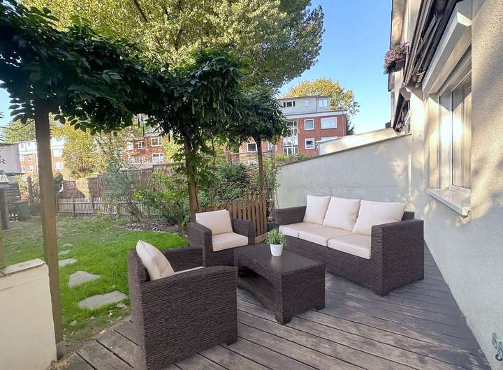 Direkt an das Haus schließt sich die großzügige, sonnige Terrasse (ca. 16 m²) an. Sie ist der ideale Ort für gemütliche Sommerabende, Grillpartys oder einfach nur zum Entspannen.