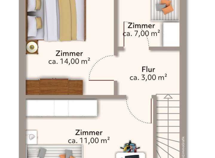 • Obergeschoss (OG): Über die Treppe gelangen Sie in das Obergeschoss, das sich ideal als Schlaf- und Rückzugsort eignet. Hier erwarten Sie das Elternschlafzimmer, ein Kinderzimmer sowie ein kleineres weiteres Schlafzimmer/Büro.