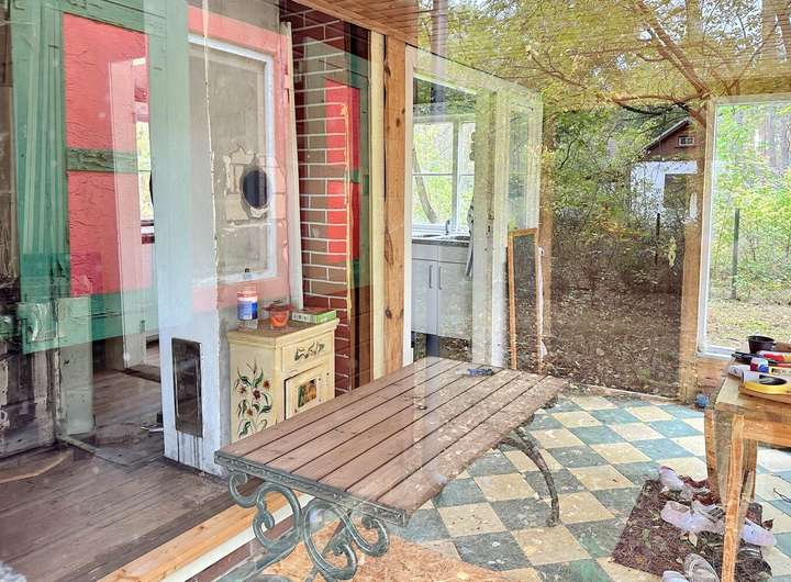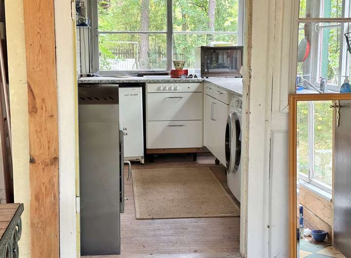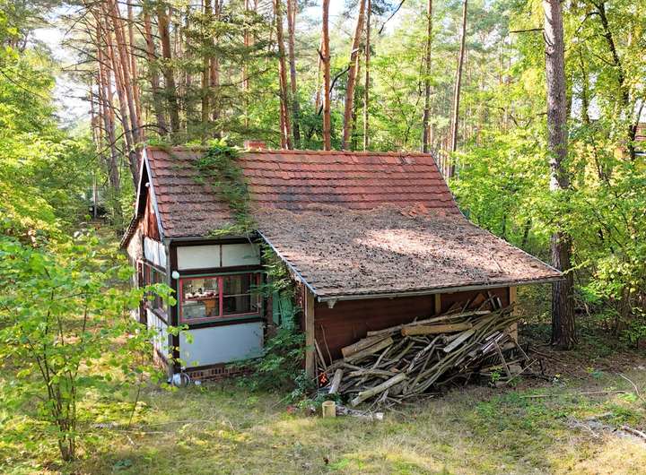 Aktuell steht auf dem Grundstück ein kleines Holzhaus mit Wintergarten, das einst als Wochenendhaus diente – charmant, aber renovierungsbedürftig. Es beherbergt ein gemütliches Wohnzimmer mit großen Fenstern, eine kleine Küche sowie ein WC. Der Mittelpunkt ist ein stilvoller Kamin, der an kühlen Abenden wohlige Wärme schenkt und den Raum mit rustikalem Charme erfüllt.