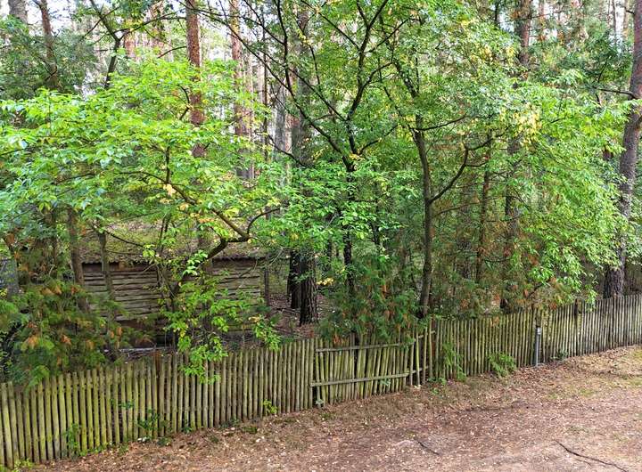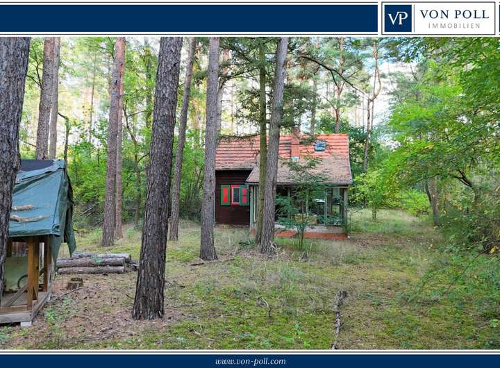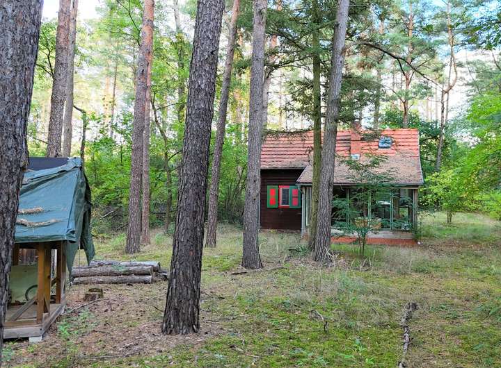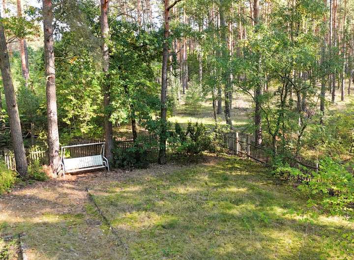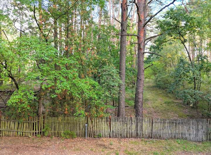 An der rechten Grundstücksgrenze beginnt ein weitläufiges Waldgebiet, dessen hoher Baumbestand dem Gebiet eine fast märchenhafte Atmosphäre verleiht. Hier rascheln die Bäume im Wind, während Sonnenstrahlen durch das dichte Grün den Boden berühren.