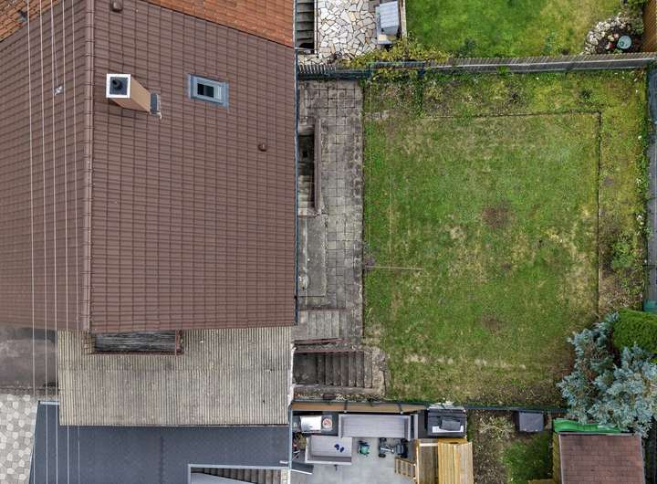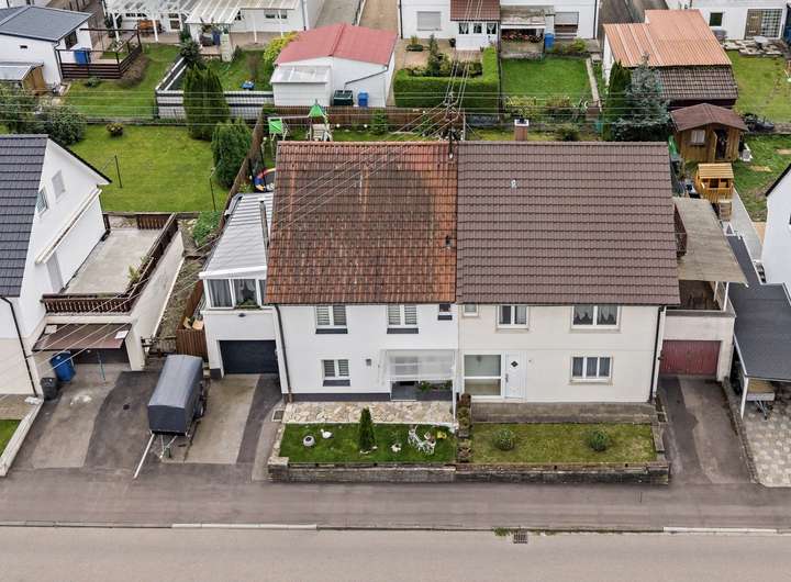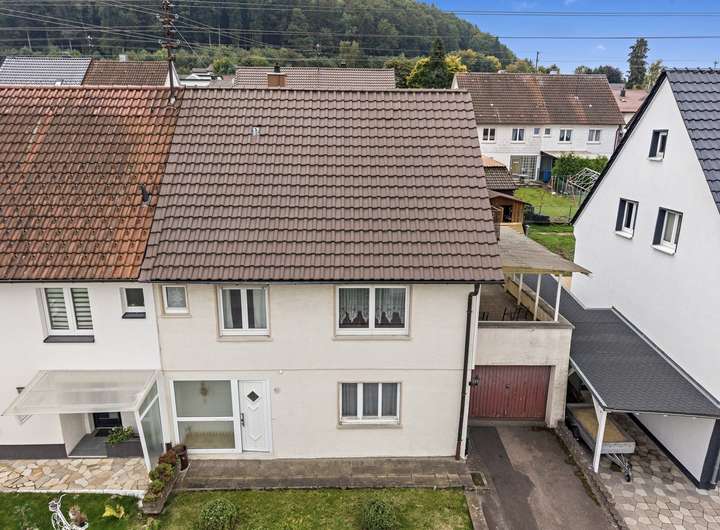 Ein echtes Highlight ist die Garage mit darüberliegender, überdachter Dachterrasse. Diese erreichen Sie bequem vom Wohnzimmer aus. Von dort aus gelangen Sie direkt in den sonnigen Garten – ein wunderbarer Ort für Ihre persönliche Auszeit oder gesellige Stunden mit Familie und Freunden.
