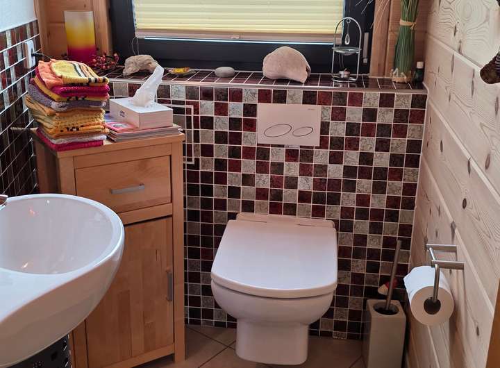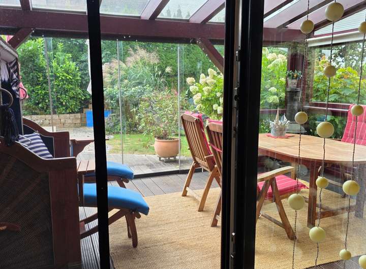 Beim Betreten des Hauses empfängt Sie ein großzügiger Flur mit stilvollen Fliesen und Mosaikarbeiten. Rechts befinden sich ein Gäste-WC und der Treppenaufgang ins Obergeschoss, während links ein gemütliches Schlafzimmer mit eigenem Duschbad en suite auf Sie wartet – perfekt für Gäste oder als privater Rückzugsort. Geradeaus öffnet sich der Herzschlag des Hauses: Der lichtdurchflutete, offene Koch-, Ess- und Wohnbereich. Linkerhand befindet sich die top-ausgestattete Einbauküche mit hochwertigen Geräten – ergänzt durch einen praktischen Vorratsraum. Im Zentrum befindet sich der Essbereich der zu geselligen Stunden einlädt. Rechterhand das lichtdurchflutete Wohnzimmer mit Zugang zu Wintergarten und Terrasse. Ein großer Kachelofen sorgt hier für wohlige Wärme im Winter. Große, 3-fach verglaste Kunststofffenster mit elektrischen Rollläden fluten den Raum mit natürlichem Licht und bieten nahtlosen Zugang zum bezaubernden Wintergarten und der sonnigen Terrasse mit beheizbarem Außenpool. Dieser sorgt im Sommer für erfrischende Abkühlung und wird durch eine separate Photovoltaik-Anlage umweltfreundlich temperiert. Der Garten, liebevoll angelegt, wird zu Ihrer persönlichen Oase der Entspannung.