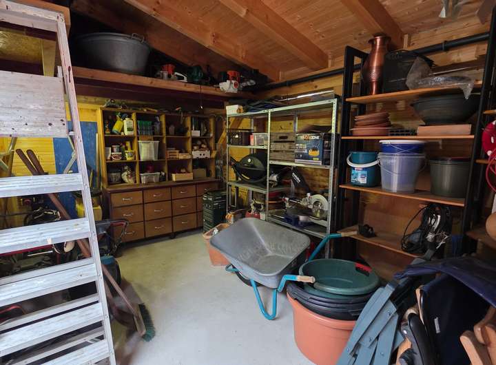Das Anwesen wird durch eine geräumige Doppelgarage perfekt ergänzt, die nicht nur Platz für zwei Fahrzeuge bietet, sondern auch mit einem praktischen Abstellraum ausgestattet ist. Dieser zusätzliche Stauraum ist ideal für Sportgeräte, Werkzeuge oder saisonale Dekoration und macht die Garage zu einem multifunktionalen Highlight für Ihre Hobbys und den Alltag.
