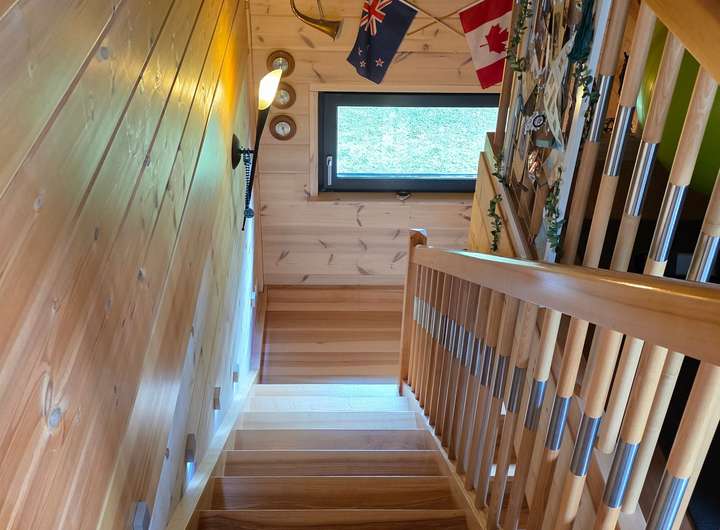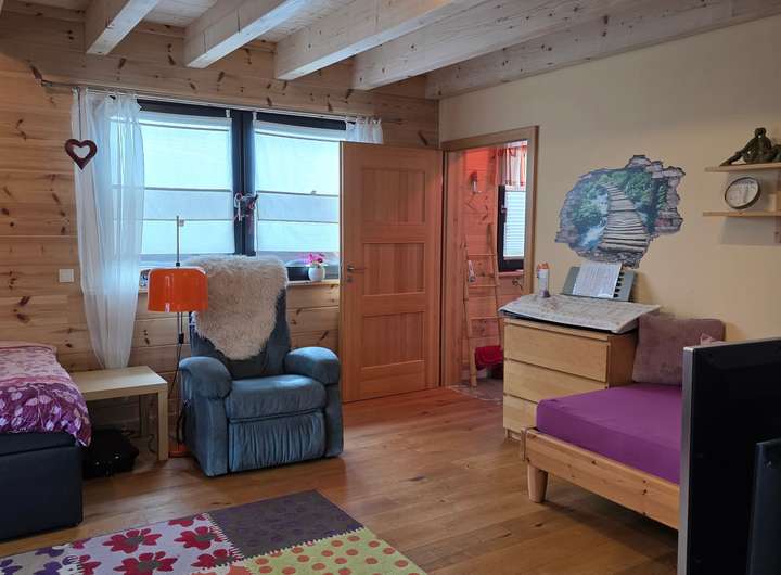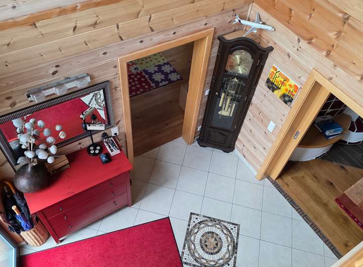 Über eine geschmackvolle Holztreppe gelangen Sie ins Obergeschoss. Dort erwartet Sie eine großzügige, offene Galerie, die mit Sichtdachstuhl beeindruckt. Die freiliegenden Holzbalken verleihen dem Raum eine Atmosphäre, die sowohl Wärme als auch Charakter ausstrahlt.