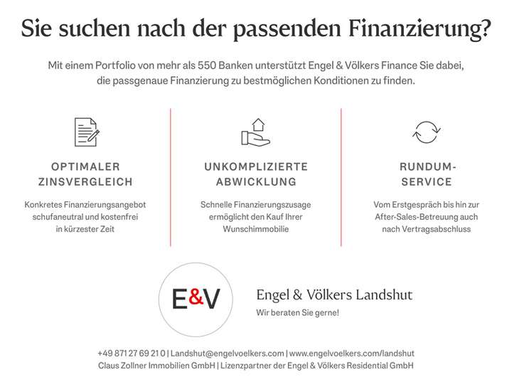 Alle Angaben sind ohne Gewähr und basieren ausschließlich auf Informationen, die uns von unserem Auftraggeber übermittelt wurden. Wir übernehmen keine Gewähr für die Vollständigkeit, Richtigkeit und Aktualität dieser Angaben. Zwischenverkauf bleibt vorbehalten. Sollte das von uns nachgewiesene Objekt bereits bekannt sein, teilen Sie uns dieses bitte unverzüglich mit. Die Weitergabe dieses Exposees an Dritte ohne unsere Zustimmung löst gegebenenfalls Courtage- bzw. Schadensersatzansprüche aus. Im Übrigen gelten die beigefügten allgemeinen Geschäftsbedingungen für die Rechtsbeziehung zwischen Ihnen und der Claus Zollner Immobilien GmbH (Lizenzpartner der Engel & Völkers Residential GmbH).
