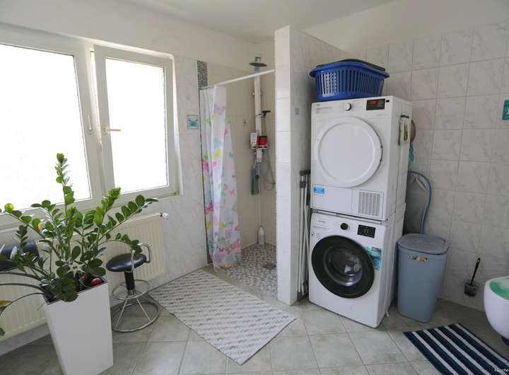 Das Tageslichtbad verfügt über eine Badewanne und eine Dusche und bietet Stellplätze für die Waschmaschine und den Trockner.