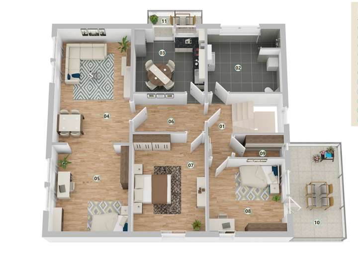 Im Obergeschoss gibt es neben dem Wohn- und Essbereich noch bis zu 3 Schlafzimmer. Ein Zimmer hat einen Ausgang auf den teil überdachten großen Balkon. Die Küche ist großzügig und hat Platz für einen Sitzbereich. Zudem hat die Küche ebenfalls einen Ausgang auf einen kleinen Balkon. Das Tageslichtduschbad ist hell gefliest. Hier können auch die Waschmaschine und der Trockner stehen.