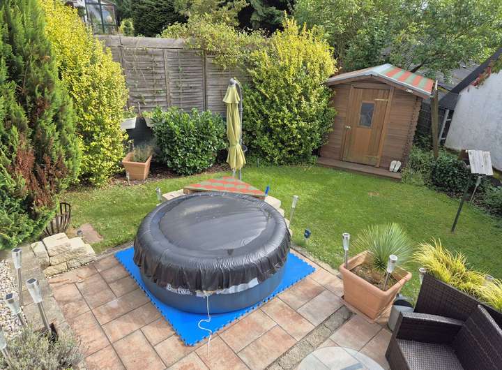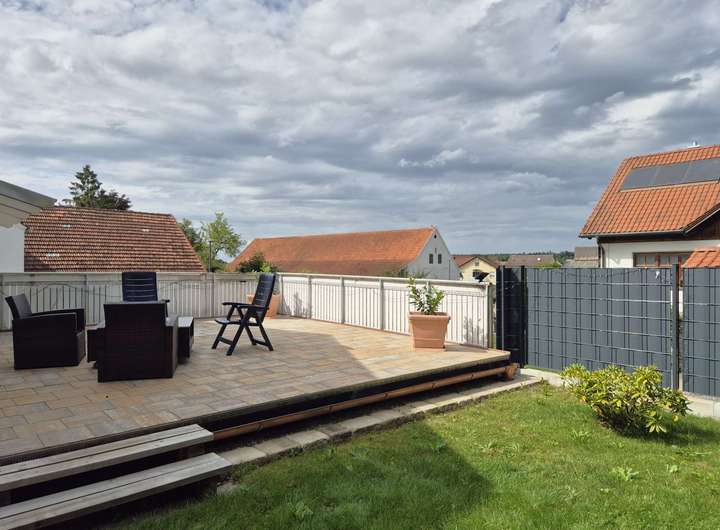 Von der Terrasse aus genießt man dank der erhöhten Lage ein herrliches Gefühl. Ein echtes Highlight ist zudem die große Dachterrasse oberhalb der Garage – perfekt geeignet für Feste, sportliche Aktivitäten oder einfach zum Sonne tanken. Der Garten ist ansprechend angelegt und lässt dennoch Raum für individuelle Gestaltungsideen.