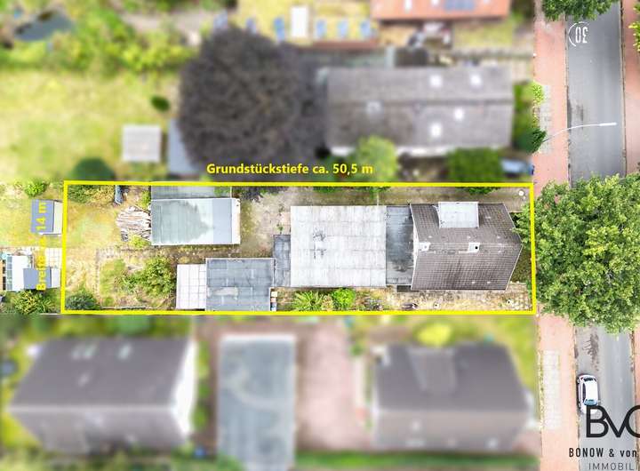 Das Grundstück ist etwa 14 Meter breit und 50 Meter tief und bietet damit vielfältige Bebauungsmöglichkeiten. Geeignet ist die Fläche sowohl für ein bis zwei Einfamilienhäuser als auch für die Errichtung eines Doppelhauses.