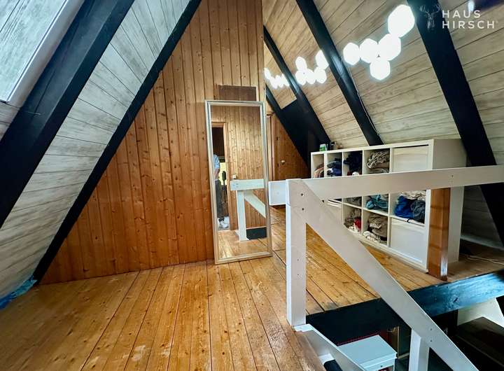 Die offene Küche lädt zum gemeinsamen Kochen ein, während der Wohnbereich mit Kamin für gemütliche Abende sorgt. Durch die vielen Fenster ist das Haus lichtdurchflutet und strahlt eine angenehme Atmosphäre aus. Über eine schlicht gehaltene Holztreppe gelangen Sie ins erste Obergeschoss, wo sich das Badezimmer mit Fenster und das gemütliche, nach Süden ausgerichtete Schlafzimmer befinden. Ein weiteres kleines Zimmer bietet Raum als Arbeitszimmer oder weiterer Schlafraum. Im Erdgeschoss ist ein Raum im Eingangsbereich mit den Anschlüssen als weiteres Bad bereits vorbereitet.