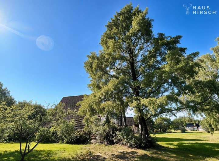Ein alter Baumbestand mit einem Apfel-, Mammut-,und weiteren Bäumen schafft eine idyllische Umgebung. Hier finden Sie Ihren grünen Rückzugsraum in der Natur, der es Ihnen ermöglicht, sich frei zu entfalten.