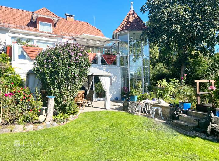 Die weitläufige Gartenanlage mit Koi-Teich, Sonnenterrasse und dichter Hecke garantiert Privatsphäre und ein Paradies im Grünen.